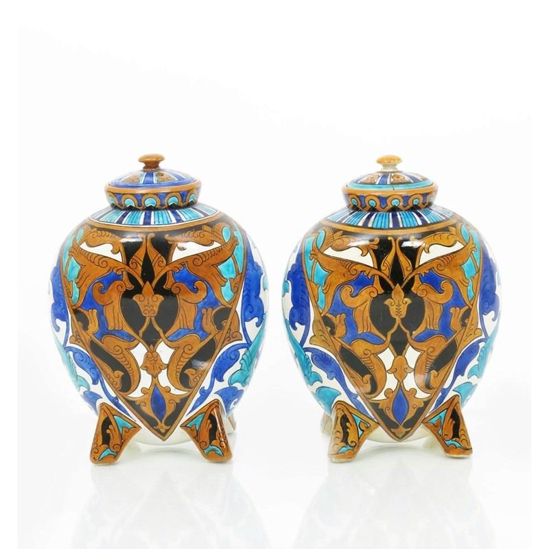 An interesting pair of Minton's Art Pottery Studio moonflasks with covers the design attributed...