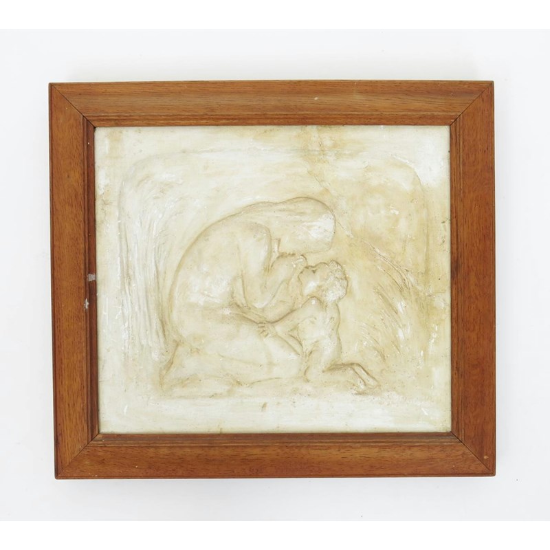 A plaster panel by Sophia Rosamond Praeger, cast in low relief with a mother and child, framed in oak signed in the cast lower right 37 x 31cm (panel)