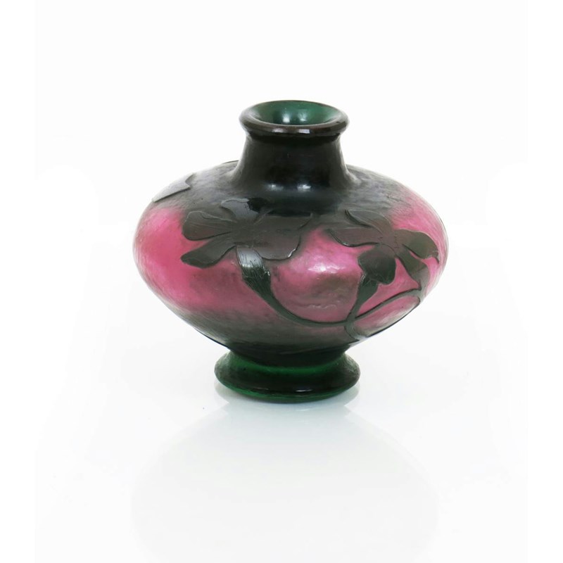 A Daum Nancy cameo glass vase with martele ground, compressed pink glass body cased in dark green, decorated with art Nouveau violet flowers etched Daum Nancy to base 9cm. high