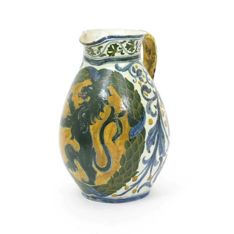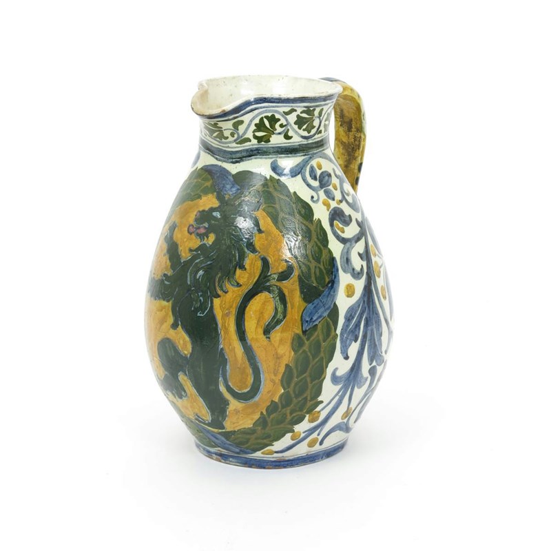 A large Della Robbia Pottery jug, dated 1895, swollen form with applied strap handle, painted with a lion rampant in green inside a laurel border, with blue scrolling foliage and yellow berries, on a cream ground painted DR mark dated 1895 30cm. high