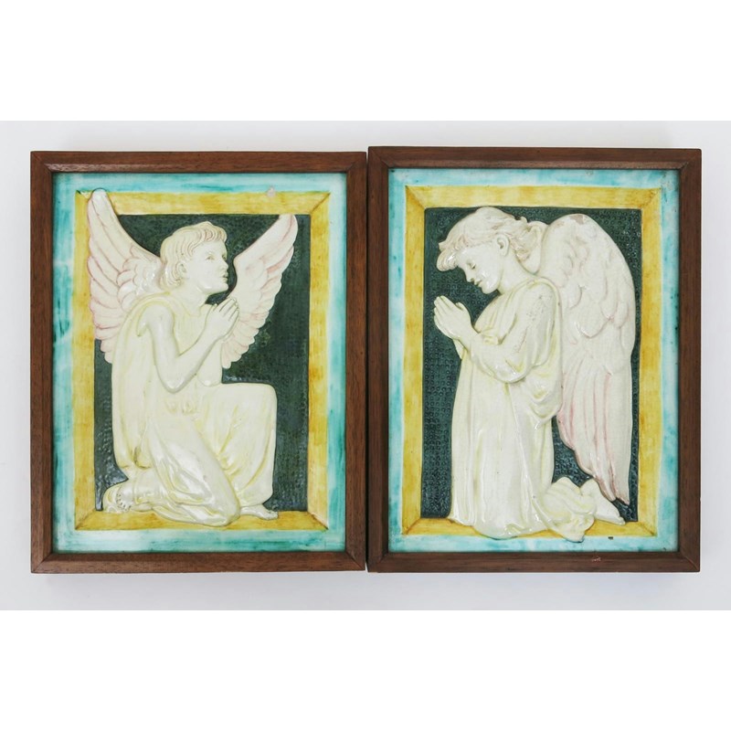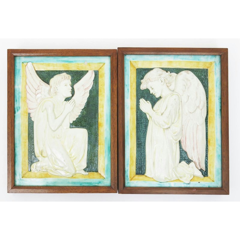 A pair of Della Robbia plaques by Ellen Mary Rope, each rectangular, cast in relief with an angel praying, glazed green, yellow and turquoise, framed, impressed Della Robbia mark 40 x 31cm.