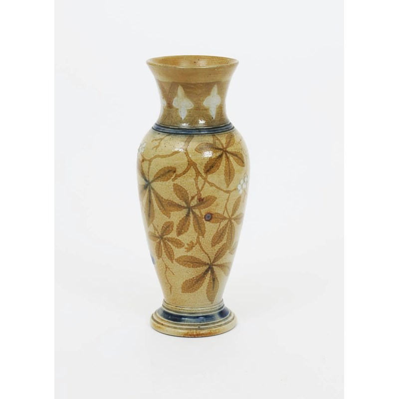 A Martin Brothers stoneware vase by Robert Wallace Martin, dated 1878, slender baluster form, with waisted neck, painted with berried foliage sprays in shades of brown and white on a buff ground, the foot with blue band incised 55 R W Martin London & Southall 5-1878, firing crack to base, professionally restored neck, 26cm. high