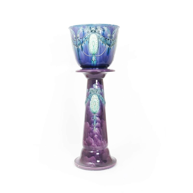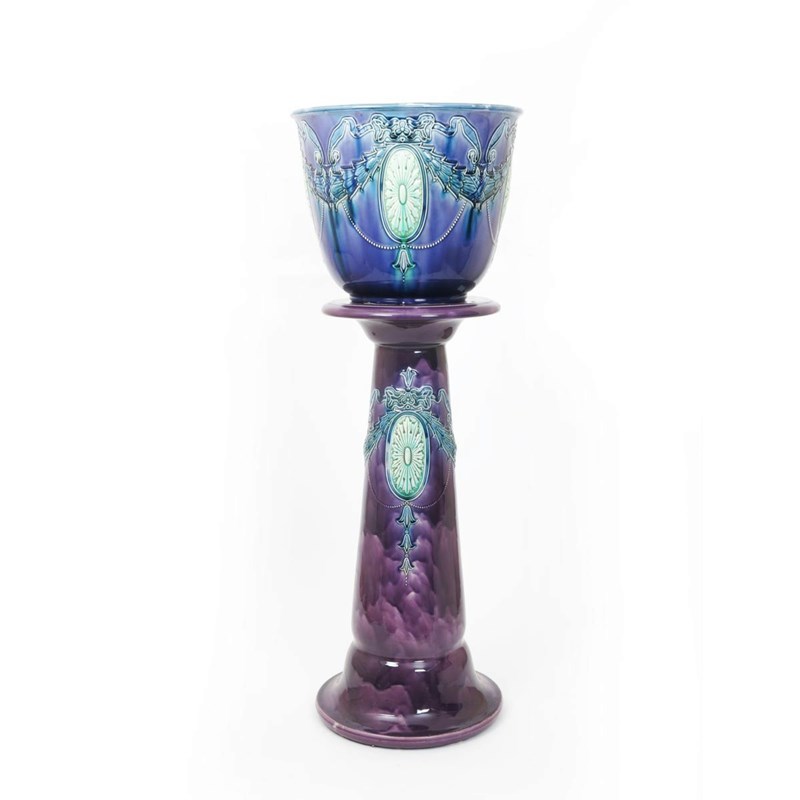 A Minton's Secessionist jardiniere and stand designed by Leon Solon and John Wadsworth, cylindrical form, cast in low relief with swags and floral medallions, in shades of blue on a purple ground unsigned, stamped 5669, 100cm. high