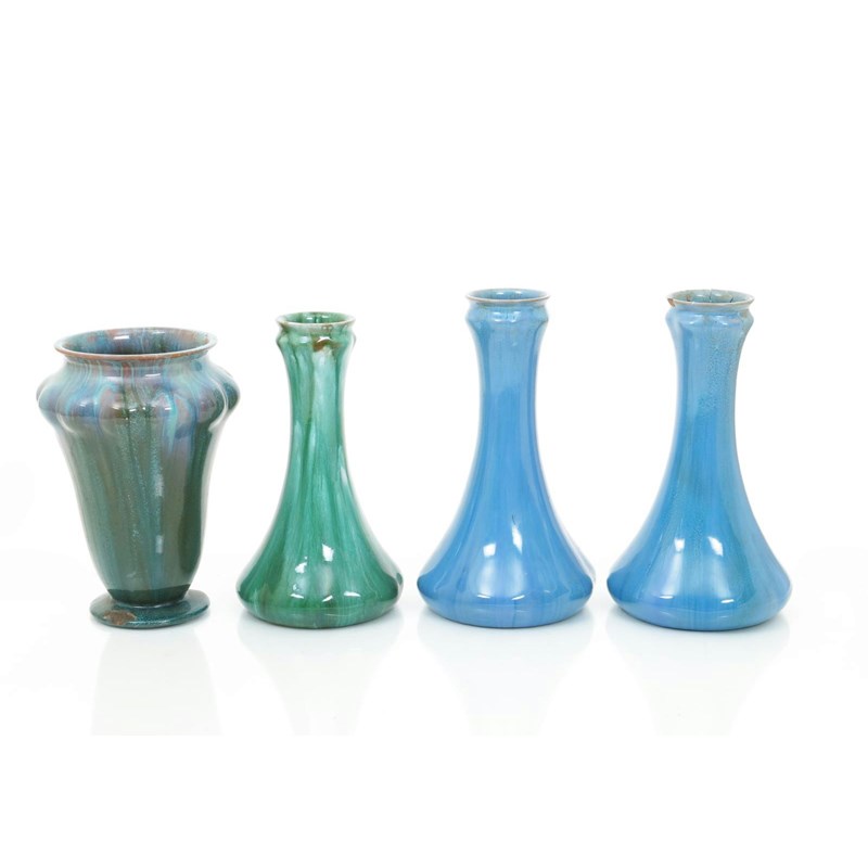 A pair of Pilkington's Royal Lancastrian vases, shape no.2786, tapering cylindrical form, covered in a streaked and curdled blue glaze, another covered in a green glaze and another Pilkington's vase impressed marks, damages and repaired chips, 27.5cm. high (4)