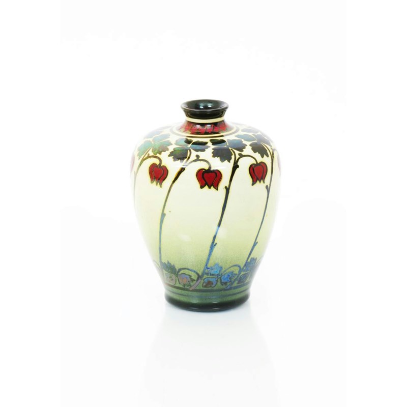 A Pilkington's Lancastrian vase by Gladys Rogers, shouldered form, painted with a frieze of bell flowers in ruby and copper lustre on a pale yellow ground impressed mark, painted cipher 13.5cm. high