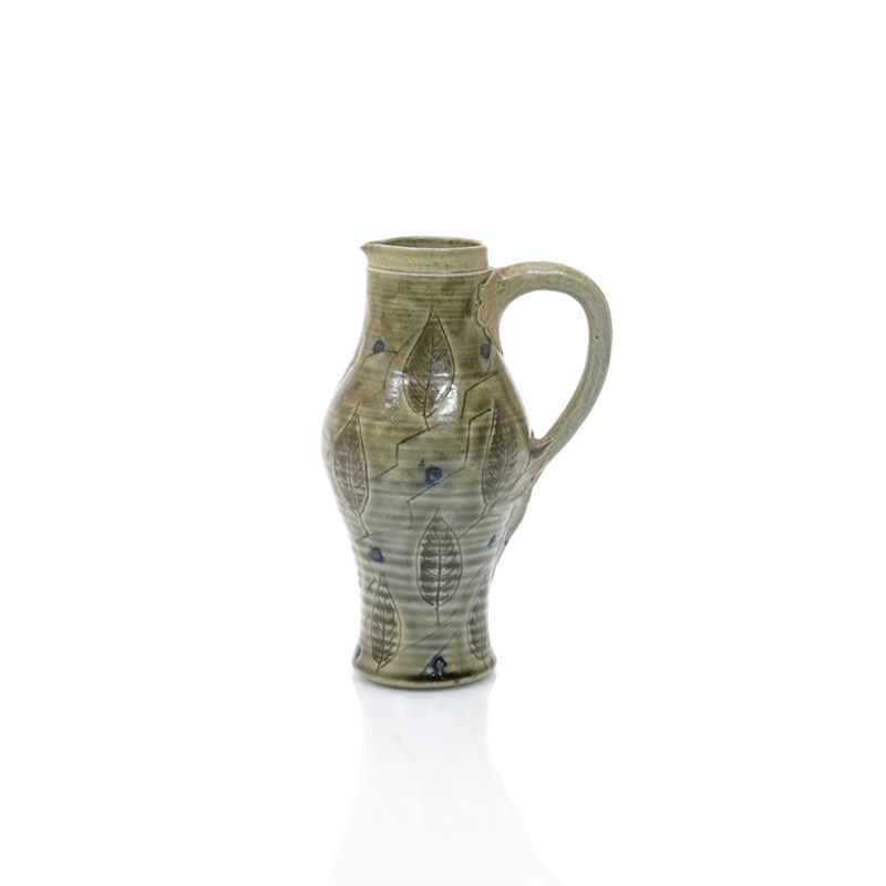 A Martin Brothers stoneware jug by Robert Wallace Martin, swollen cylindrical form, incised with simple leaf design, glazed in shades of green, impressed R W Martin stamped mark, minor restored chip to edge of top rim, 23cm. high