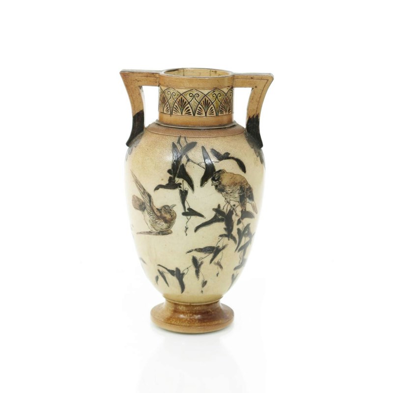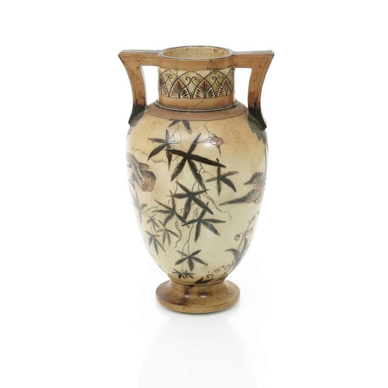 A Martin Brothers stoneware vase by Robert Wallace Martin, dated 1885, shouldered form with applied twin-handles, incised and painted with finches flying and perched on a passion flower vine, above lily of the valley flowers, in shades of green and brown on a buff ground incised 1-1885, R W Martin & Bros London & Southall, repaired neck, 24cm. high