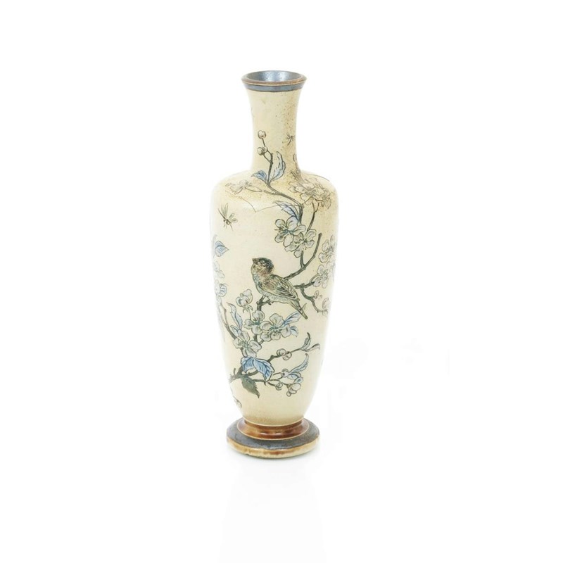 A Martin Brothers stoneware vase, dated 1898, slender baluster form, incised and painted with finches flying after a butterfly, in shades of brown and green on a buff ground, incised 8-1898, Martin Bros London & Southall, firing crack to shoulder and also one to base, 25cm. high