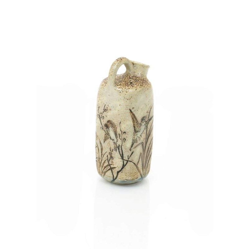 A Martin Brothers stoneware miniature ewer, square section with looped handle, incised and painted with birds flying above bull rushes, above a river, in shades of brown and blue on a buff ground, incised Martin London 11.5cm. high