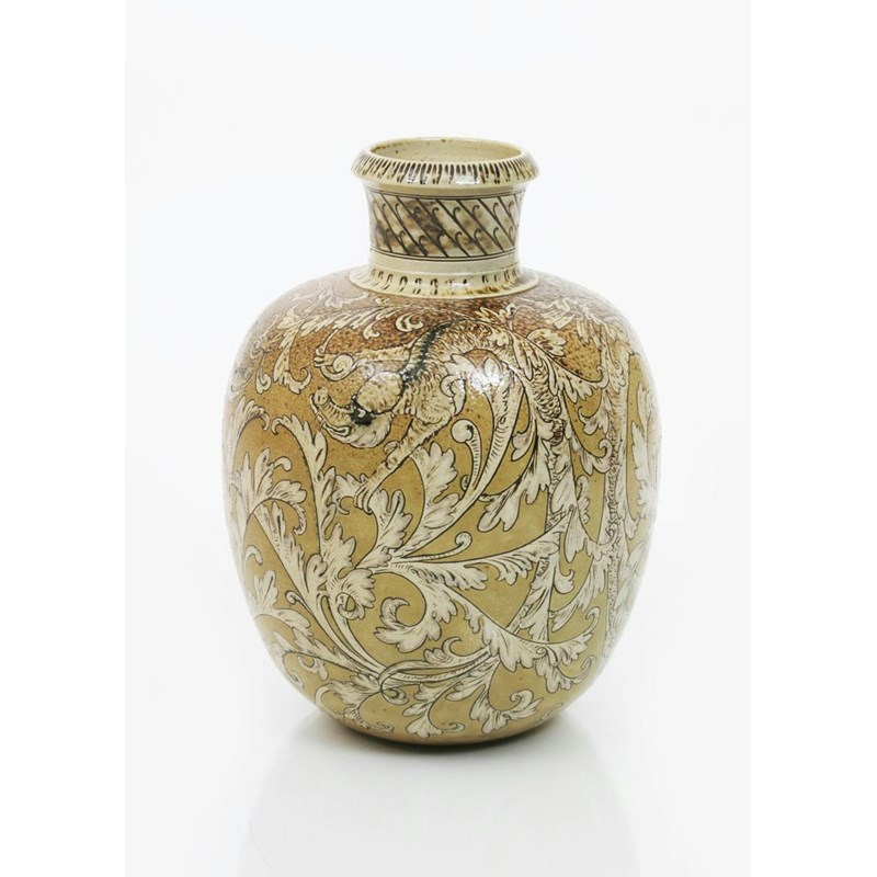 A Martin Brothers stoneware vase by Robert Wallace Martin, incised with mythical dragon creatures issuing from scrolling foliage, glazed in brown and white on a buff ground, incised 3-1889, R Martin & Bros London & Southall, 22cm. high