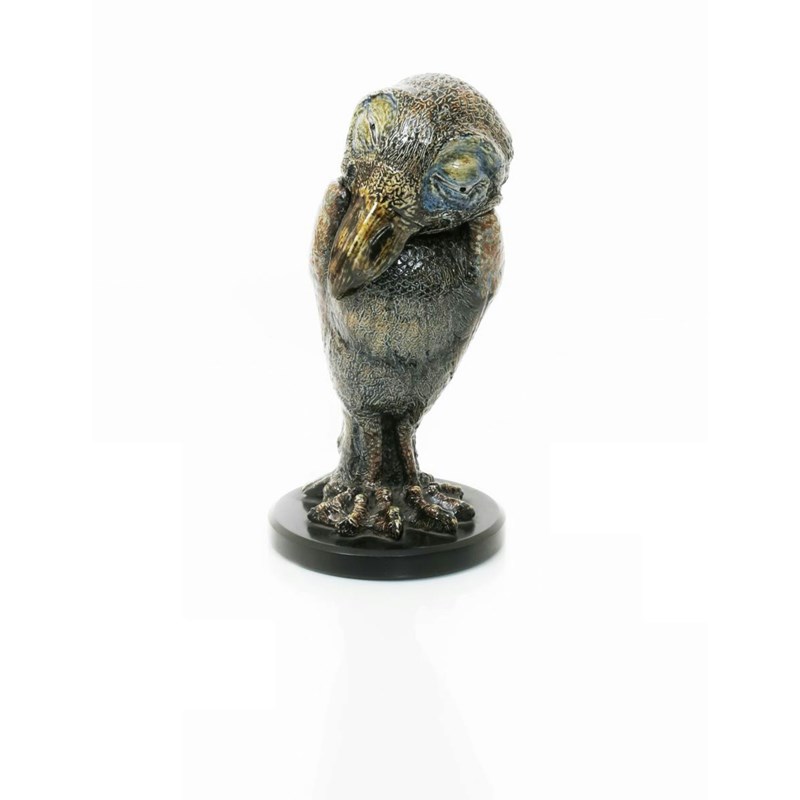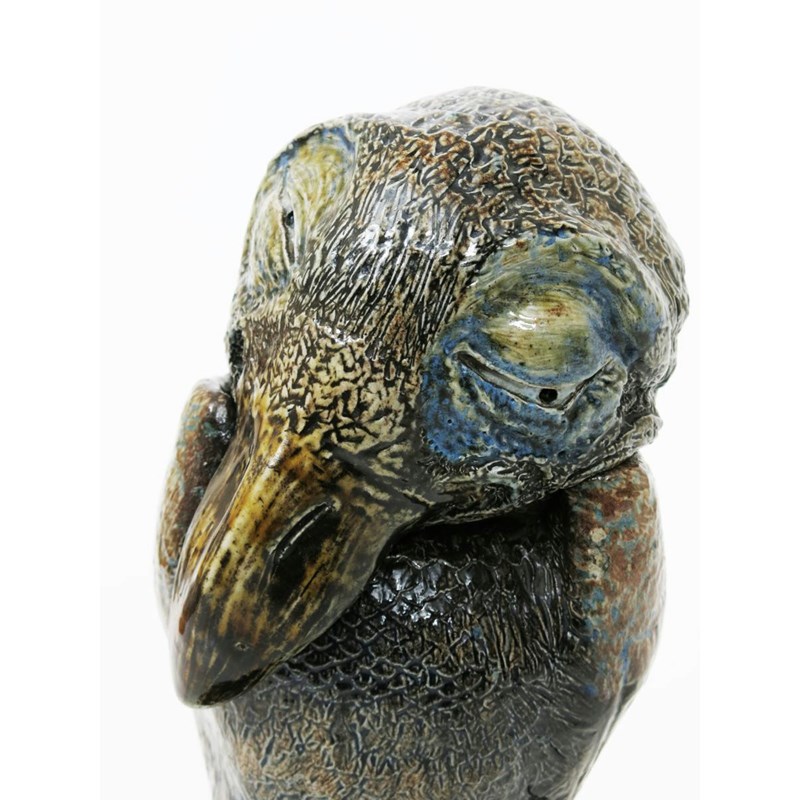 An early Martin Brothers stoneware bird jar and cover by Robert Wallace Martin, dated 1884, modelled slightly hunched with head nestling in the wing tips, with downcast eyes and long beak, large webbed claw feet, glazed in shades of green, brown and blue, on ebonised wood base, signed to the back of the wing R W Martin London 1884, the head signed to the rim R W Martin & Bros London & Southall 4-1884, and unusual painted Martin London mark, applied paper Martin ware labels to base, small chip to glaze, minor frits 34cm. high