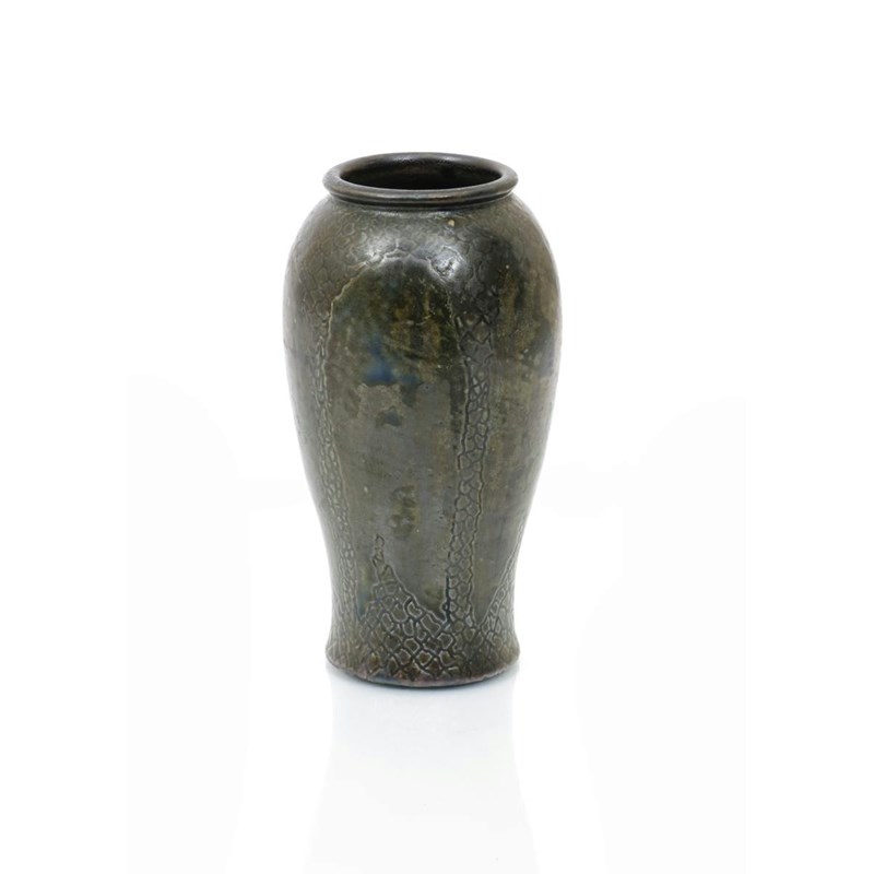 A Martin Brothers stoneware vase by Robert Wallace Martin, incised with foliate design, glazed in shades of green, incised R W Martin & Bros Southall, small chips to base rim 19.5cm. high