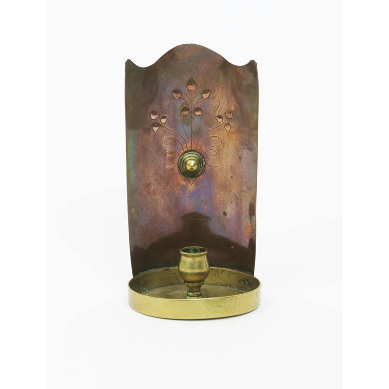 A rare W.A.S Benson copper and brass chamberstick designed by George Heywood Sumner, the curved backplate stamped in relief with simple heart-shaped foliate design, unsigned 22.5cm. high