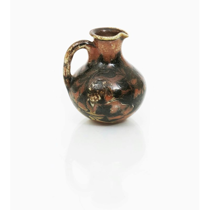 A Martin Brothers stoneware jug by Edwin & Walter Martin, ovoid, incised with birds amidst ivy leaf decoration in shades of brown on a buff ground, incised Martin Bros London & Southall, 8cm. high