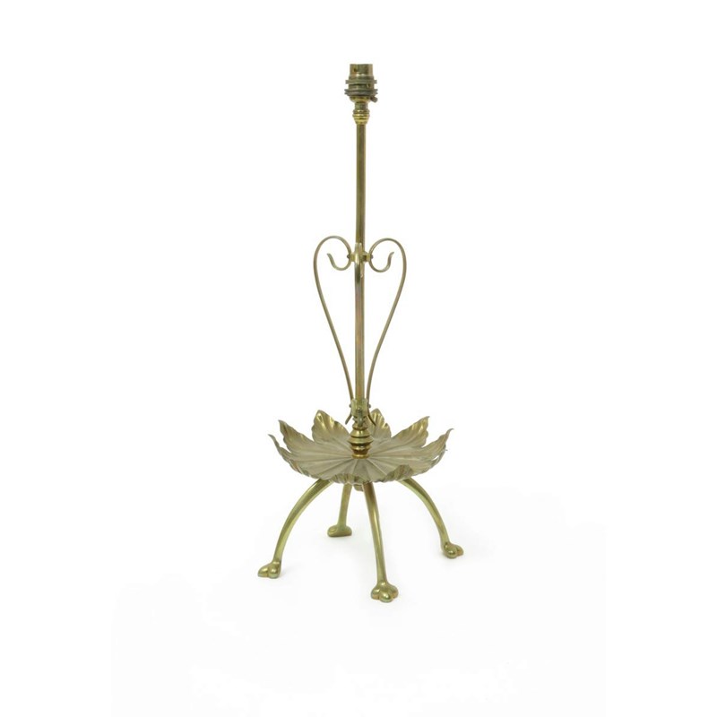 A W.A.S Benson copper and brass table lamp, model no.1195, the arched cruciform foot supporting foliate tray and central brass column, unsigned 52cm. high