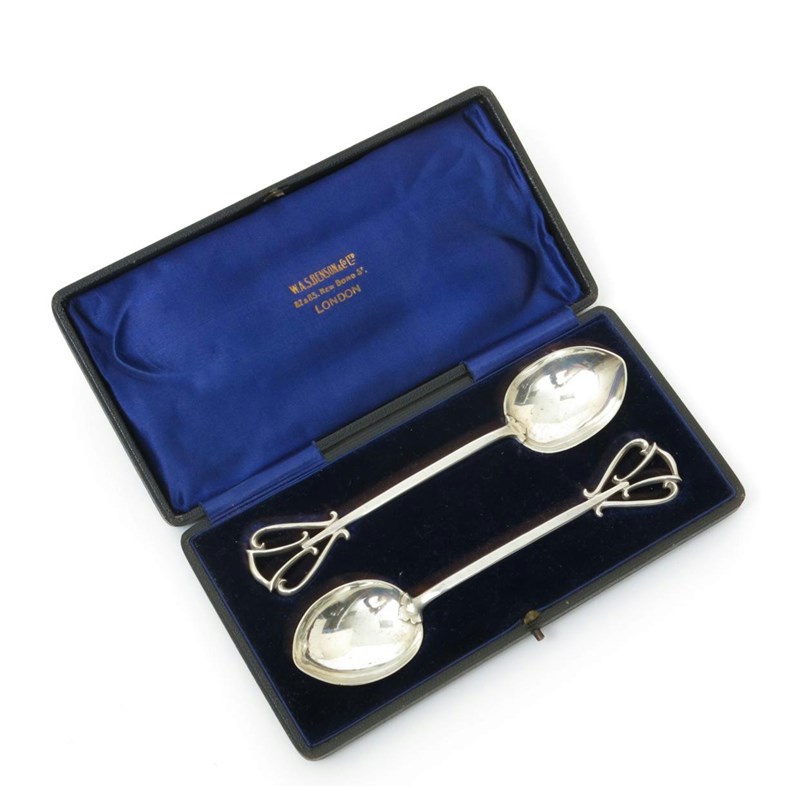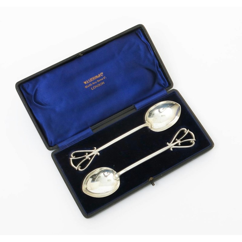 A rare pair of W.A.S Benson silver spoons in original silk-lined fitted case