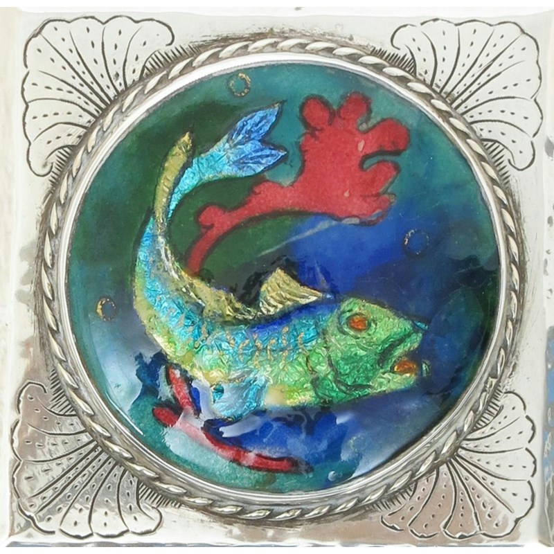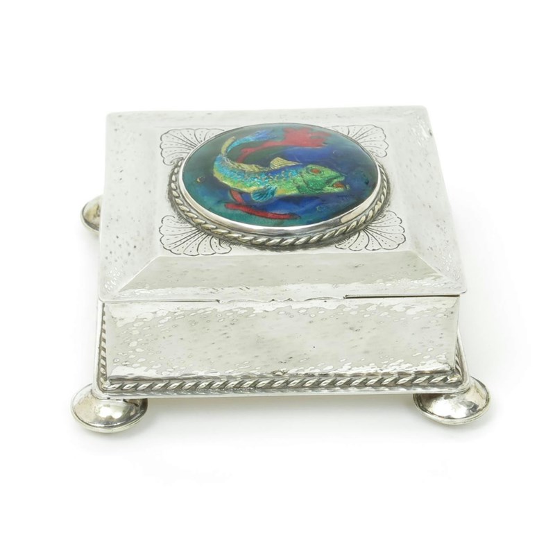 An electroplated box set with enamel roundel probably by The Guild of Handicrafts, square section on four bun feet, the hinged cover with chased foliate design and central enamel roundel of a fish before waterweed, in colours unsigned 11.5cm. wide