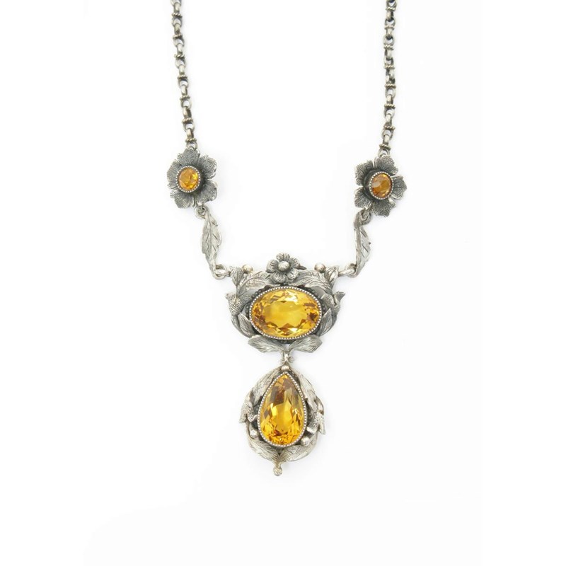 A silver necklace mounted with citrines, the centre section mounted with an oval-shaped and pear-shaped citrine pendant in textured foliate mounts. With a further two circular-cut citrines mounted in flowerheads, fancy-link neck chain unsigned, 42cm long.