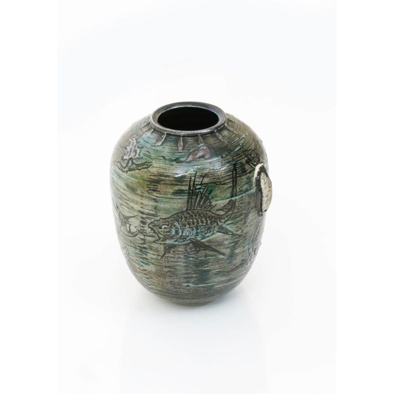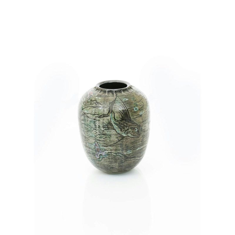 A Martin Brothers stoneware Aquatic gourd vase by Edwin and Walter Martin, dated 1914, shouldered form, incised with fish, snails and an eel glazed green and brown on a green ground incised 2-1914 Martin Bros London & Southall, Kiln Kiss to side of vase 8.5cm. high