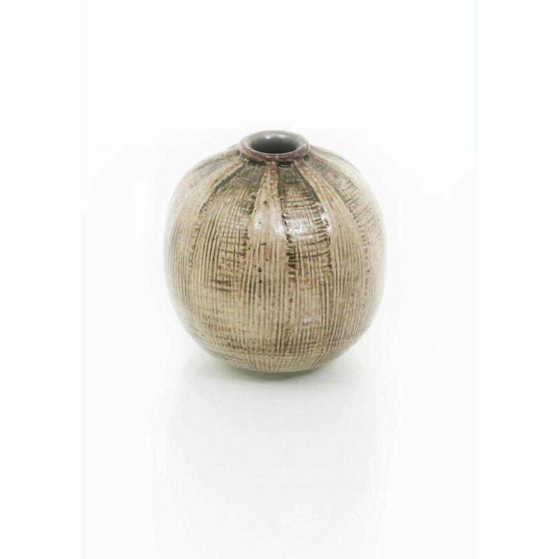 A Martin Brothers stoneware gourd vase by Edwin & Walter Martin, dated 1907, ovoid form incised and modelled with vertical ribs to the shoulder, glaze green and brown on a buff ground incised 6-1907 Martin Bros London & Southall, 5.5cm. high