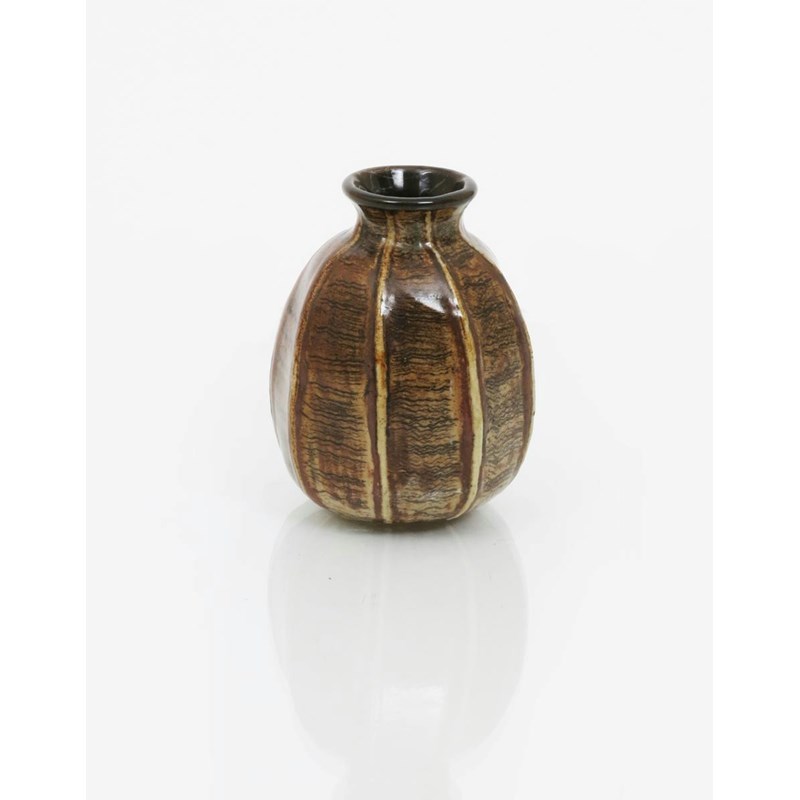 A Martin Brothers stoneware gourd vase by Edwin & Walter Martin, dated 1899, veined ovoid form, painted in shades of brown with fine horizontal veins incised 1-99 Martin Bros London, restored neck, paper collection number, 7.5cm. high