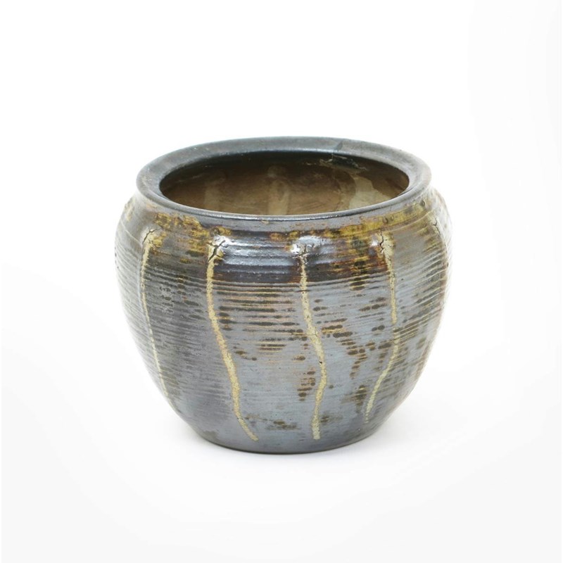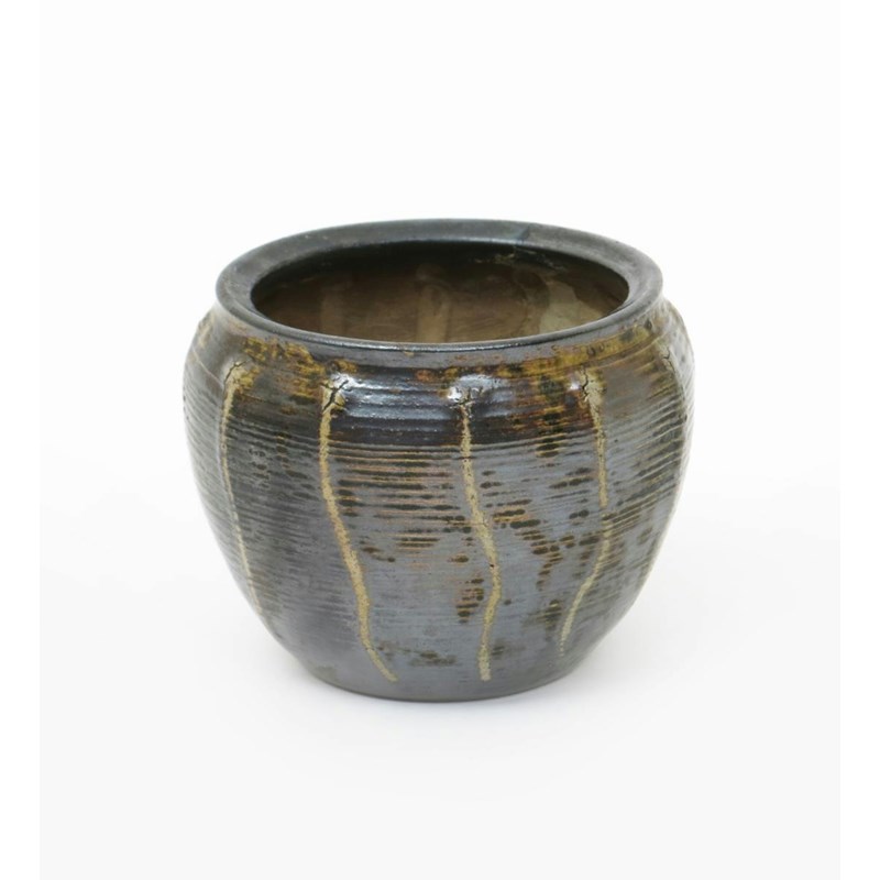 A Martin Brothers stoneware gourd jardiniere, dated 1912, ribbed, collar form, covered in a mottled brown glaze incised 11 -1912 Martin Bros London & Southall, hairline to side 9.5cm. high