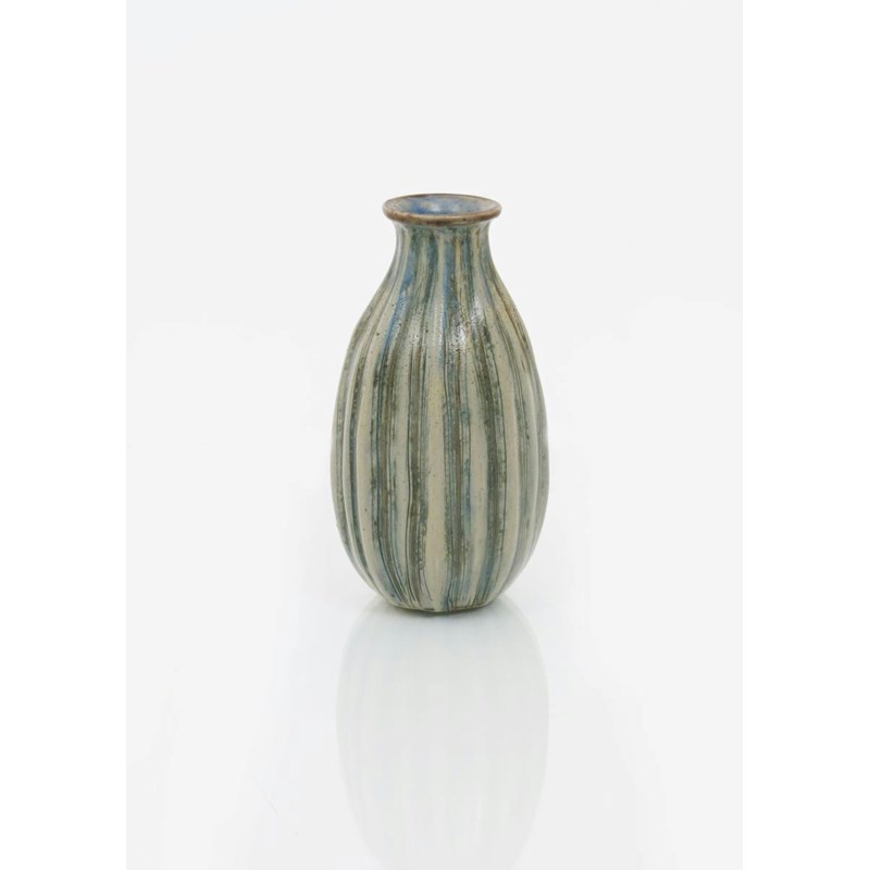A good Martin Brothers stoneware gourd vase by Edwin & Walter Martin, slender ribbed form with everted rim, glazed blue and green on a buff ground incised 7-99 Martin Bros London & Southall, 14cm. high