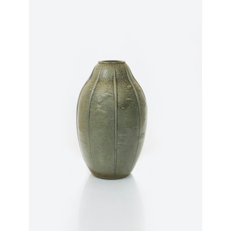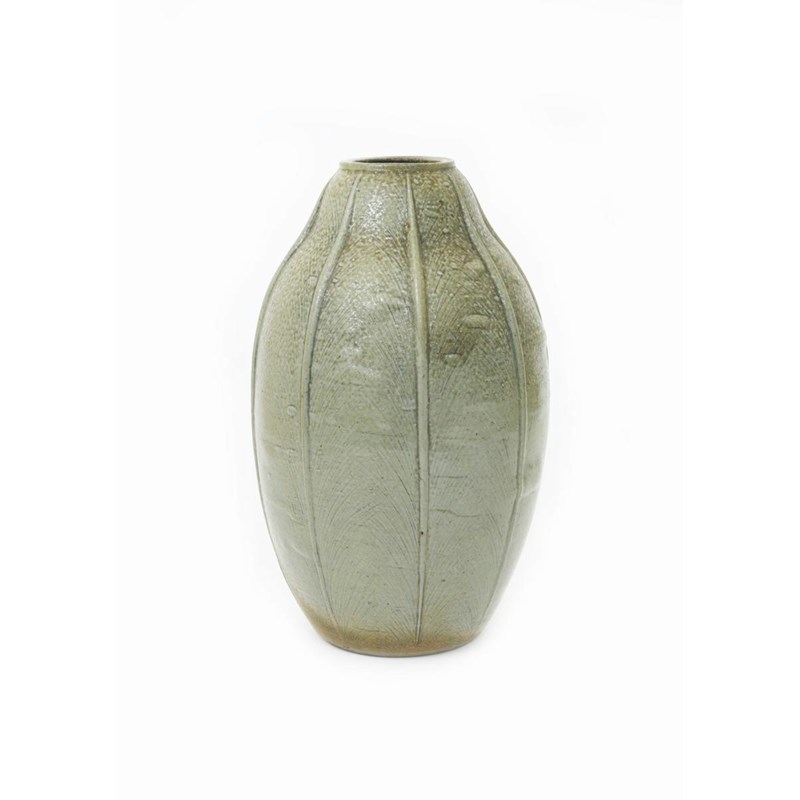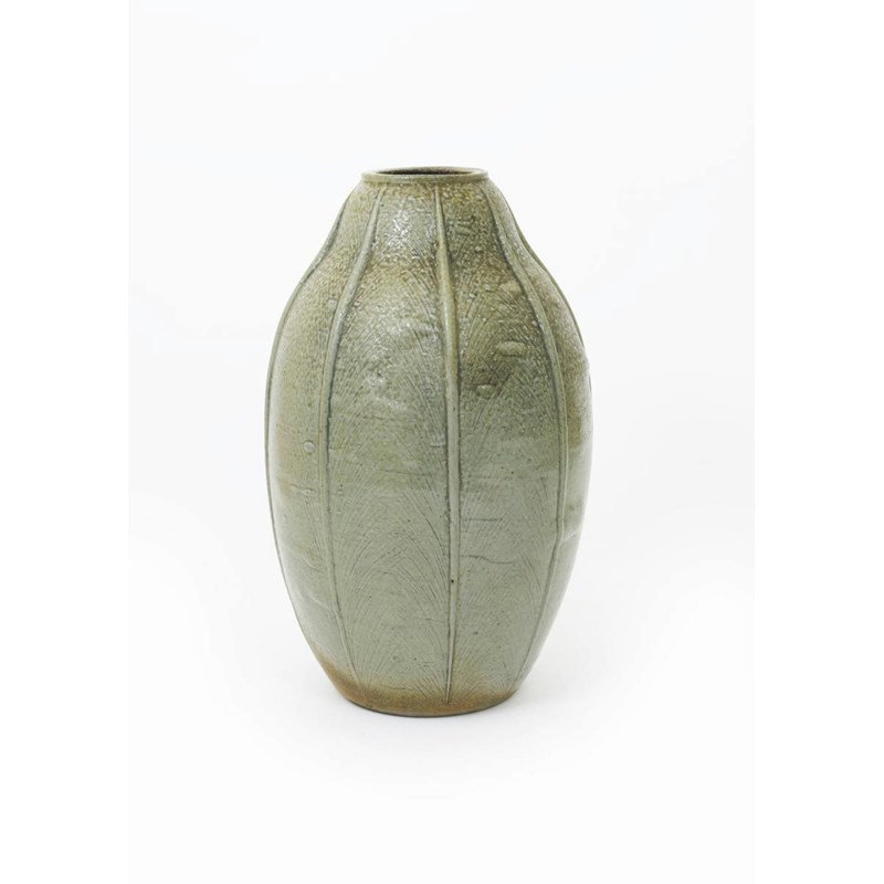 A large Martin Brothers stoneware gourd vase, probably by Colonel Butterfield, shouldered , ribbed form with finely incised marks, covered in grey/green glaze incised Martin Bros London & Southall, 1910, 43cm. high