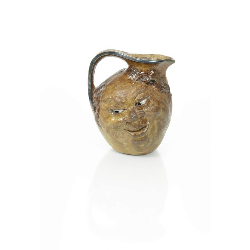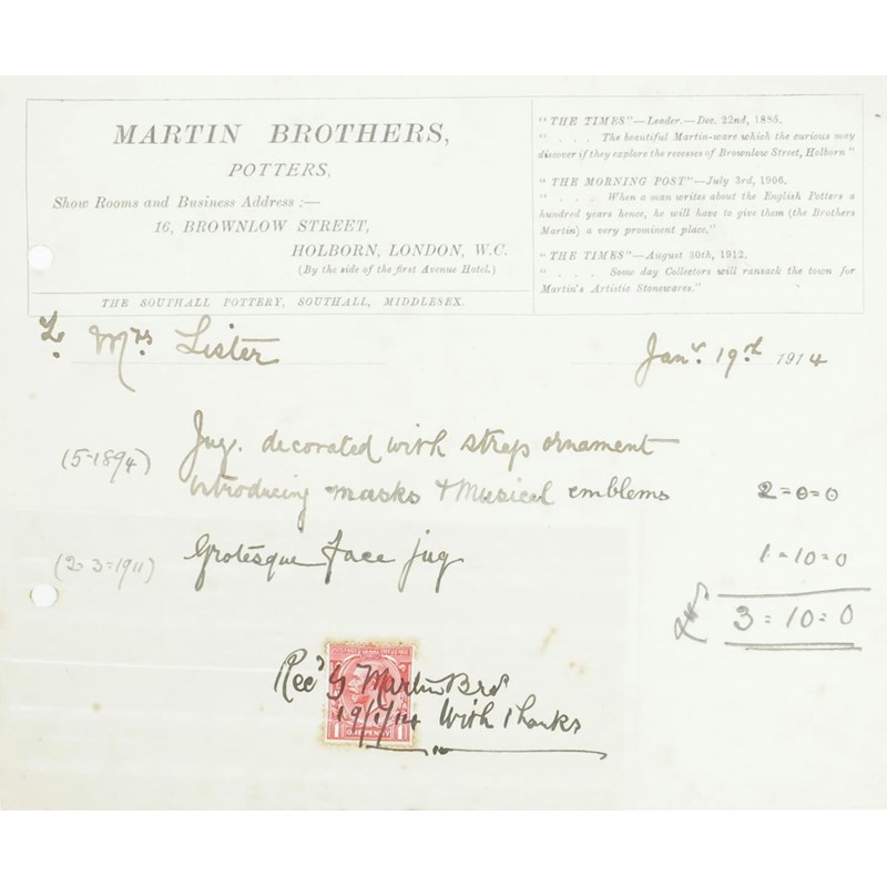 A Martin Brothers stoneware face jug by Robert Wallace Martin, modelled with a smiling face to both sides, glazed brown, highlighted in black and white, with receipt from the Martin Brothers dated 1914 to Mrs Lister, incised R W Martin & Bros London & Southall 2.3.1911, 14cm. high (2)