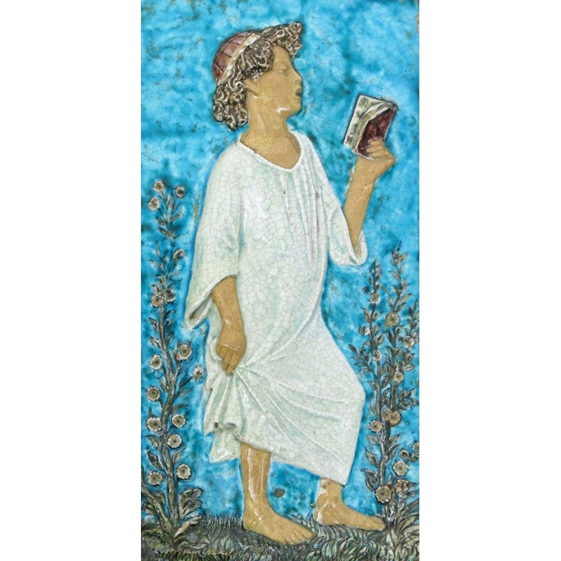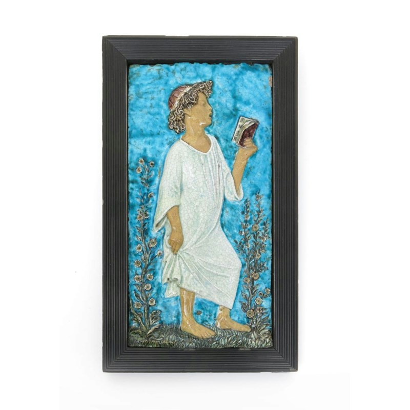 A Pre-Raphaelite tile plaque, rectangular cast in low relief with a classical figure reading from a book, before flower stems, glazed in colours on a turquoise ground, with ebonised wood frame chips to edges, 35 x 17.5cm.