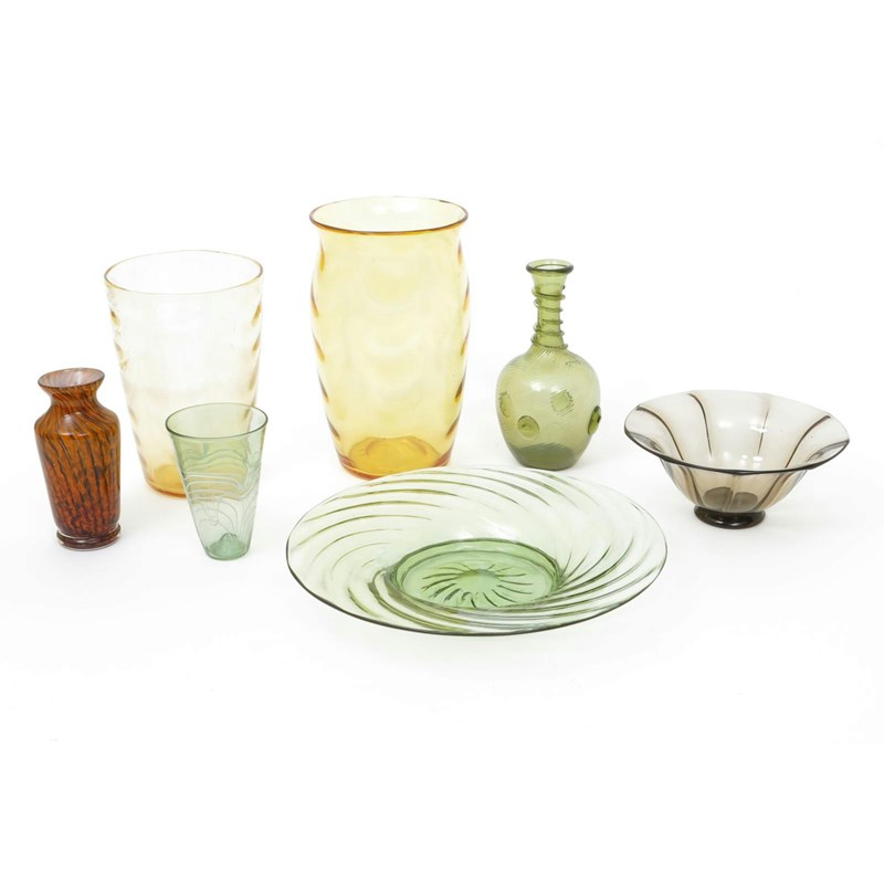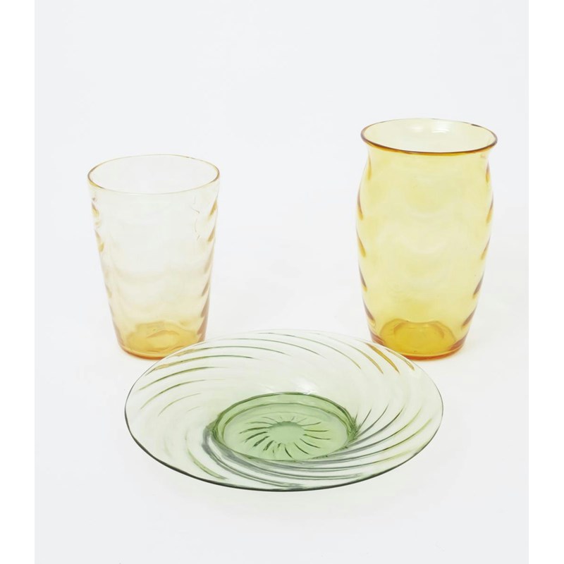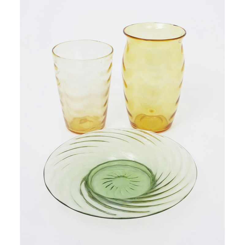 A Whitefriars Golden Amber wave ribbed tumbler glass vase designed by Marriott Powell, another similar, a green glass bowl and four other glass items unsigned 19.5cm. high (7)