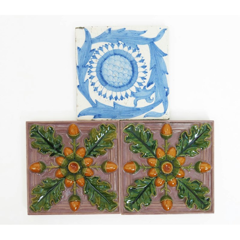 A Dutch Sunflower tin glaze tile designed by William Morris or William De Morgan, painted in shades of blue on an off white ground, and two Maw & Co tiles moulded in relief with radiating oak leaf and acorn design, and a slate panel, impressed marks to Maw tiles, glaze chips, 15.5cm. square (4)