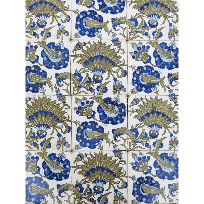 A Morris & Co Elsley twelve tile panel, tin-glazed tiles in shades of blue and green on a cream ground, framed, each tile 13cm. square