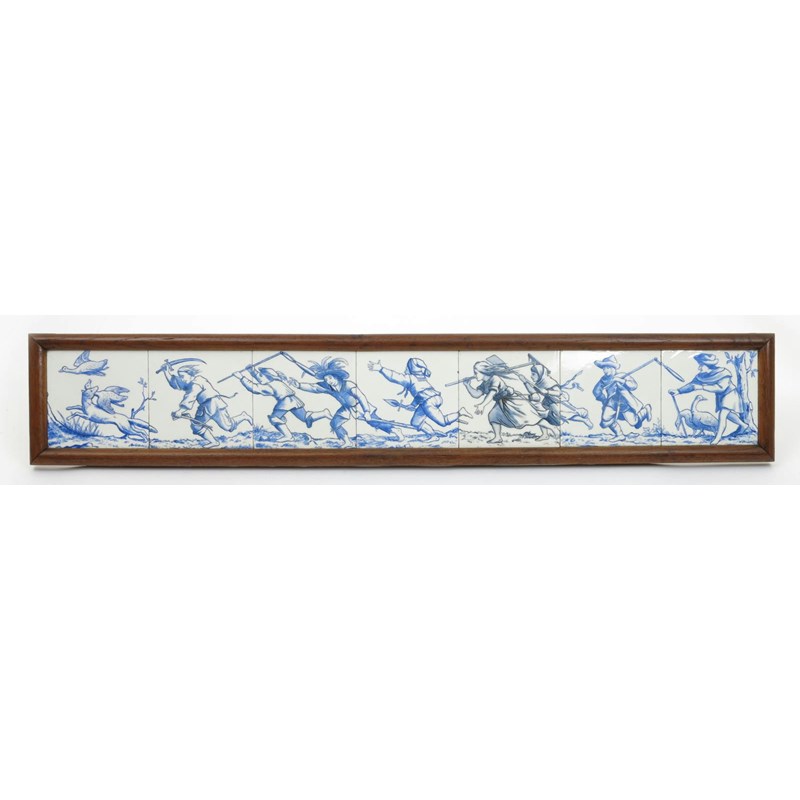 A seven tile panel probably by Minton's, painted in shades of blue with medieval villagers chasing a fox that has caught a duck, framed 111 x 20cm.