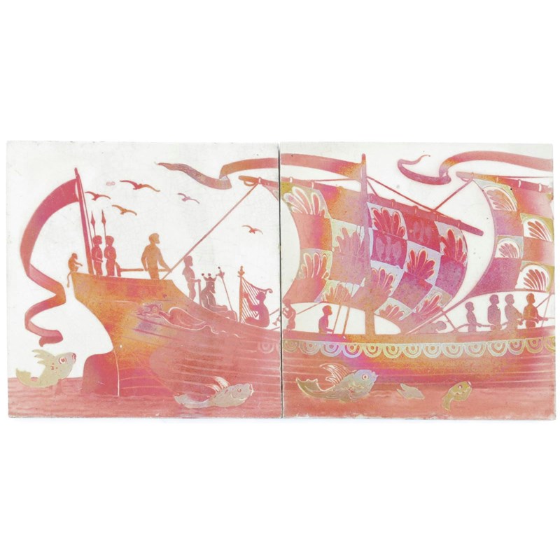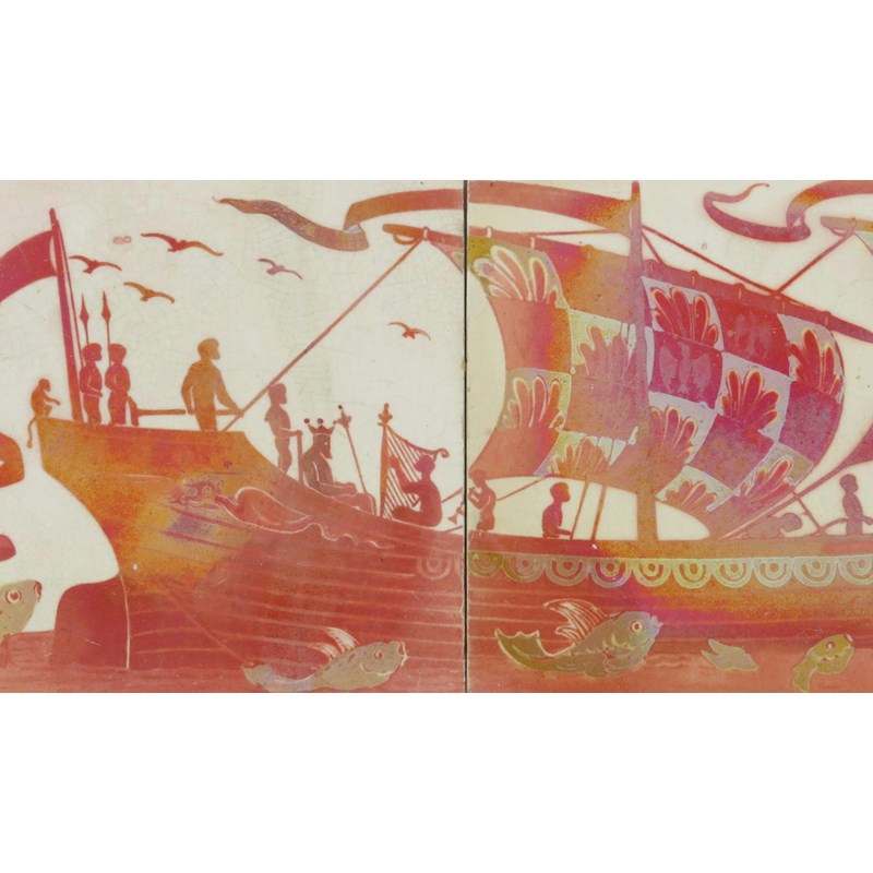 Two William De Morgan Galleon lustre tiles, part of a three tile panel, in ruby and copper lustre on a cream ground impressed Craven Dunnill blanks, 15.5c. square