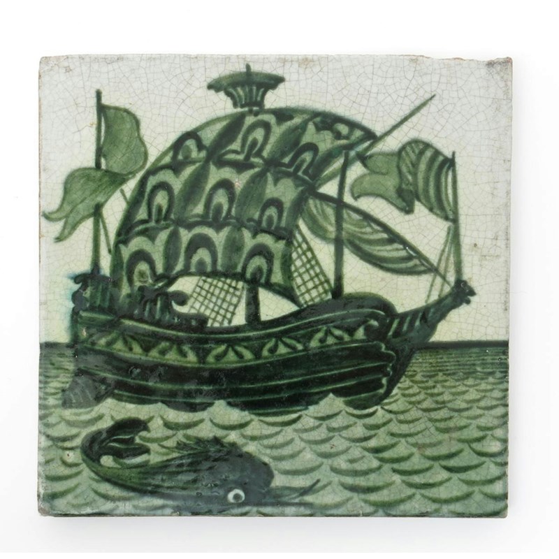 A William De Morgan Sand's End Pottery Galleon tile, painted in full sail with a dolphin in the foreground, in shades of green on a white ground impressed rose mark, minor chips, 15.5cm. square