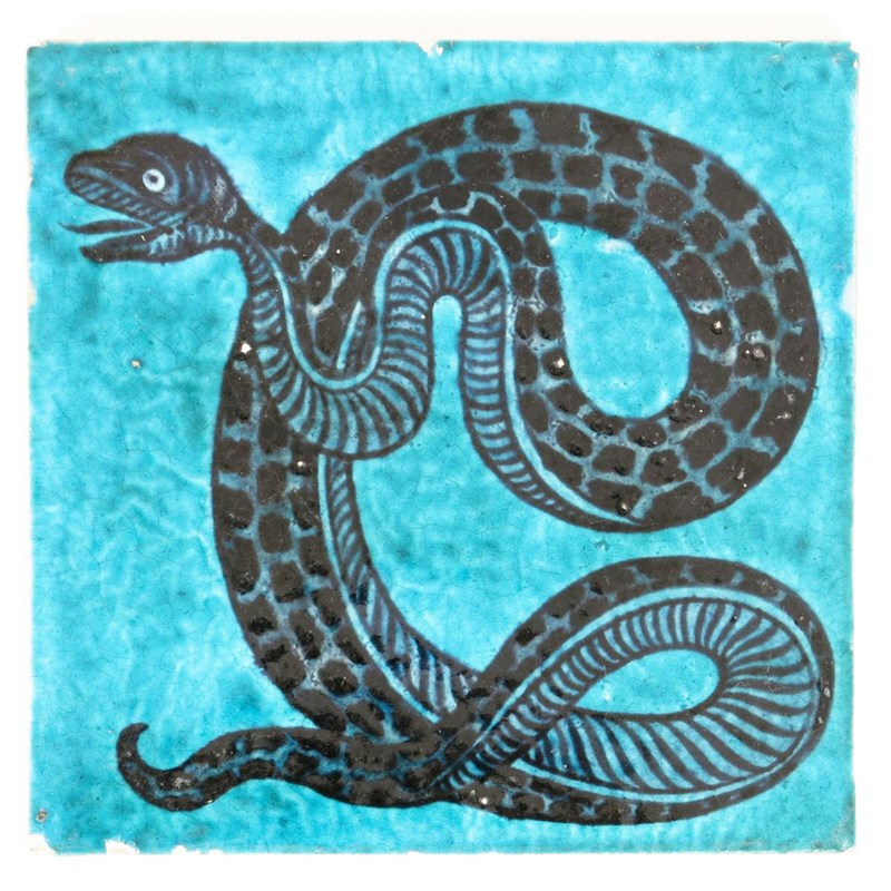 A rare William De Morgan Sand's End Pottery tile, painted with a serpent in black on a blue ground impressed factory mark, tiny glaze chips, 15.5cm. square