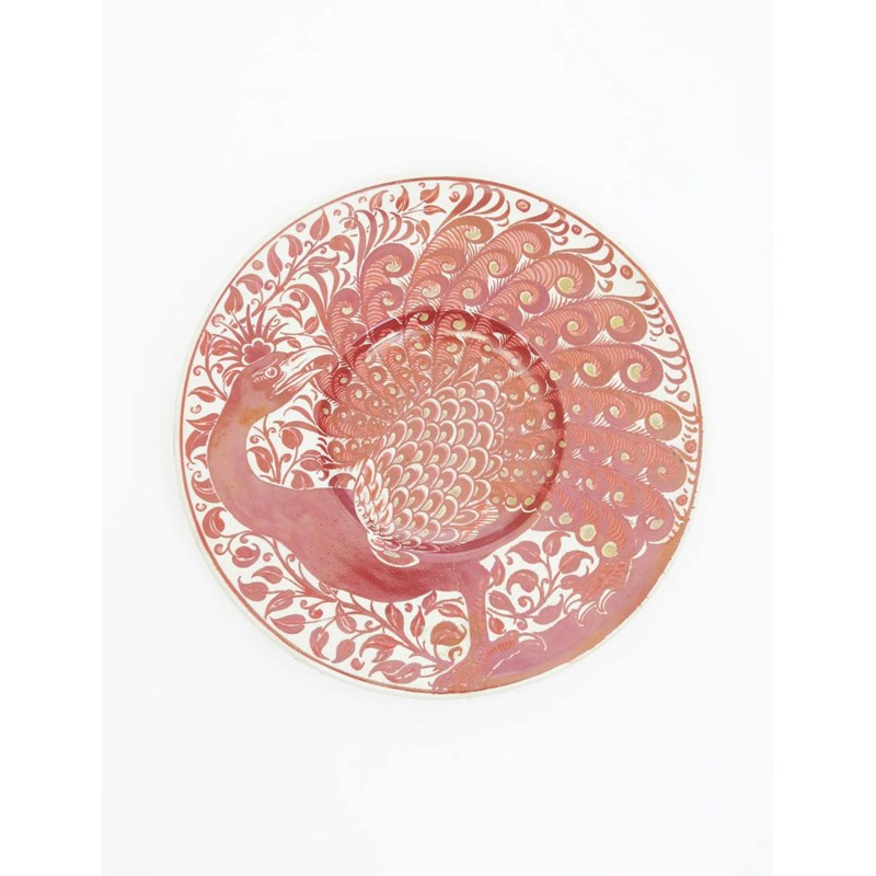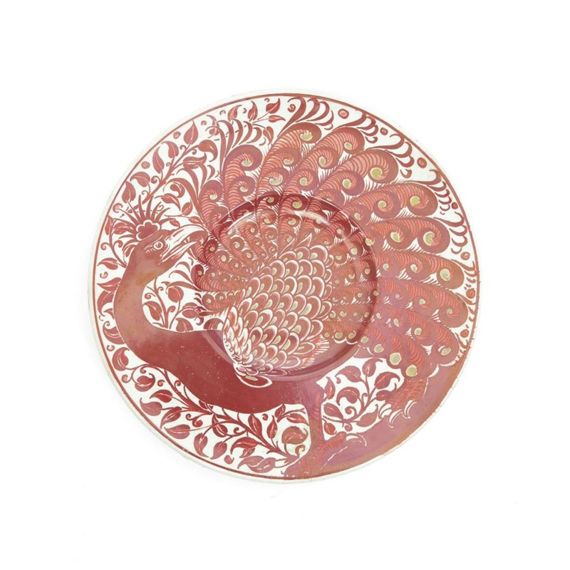A William De Morgan plate, painted with a peacock in ruby and sand lustre on a cream ground, the reverse with radiating scrolling feather motif, unsigned, crack to rim, 31cm. diam.
