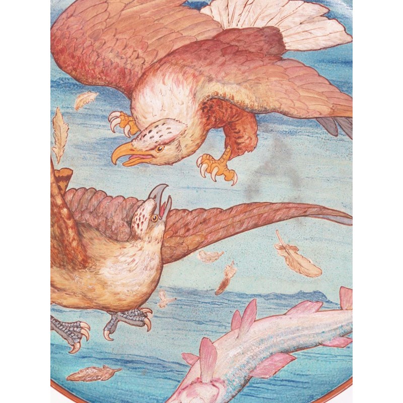 An impressive large Minton's wall charger, dated 1889, painted with an eagle swooping down on another eagle who drops its catch of a large salmon in surprise, in colours on a blue ground impressed marks, date code S for 1889, painted artist monogram 49cm. diam.
