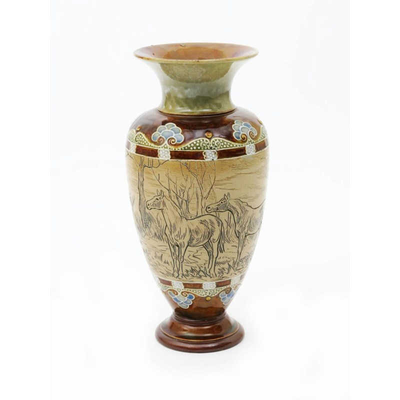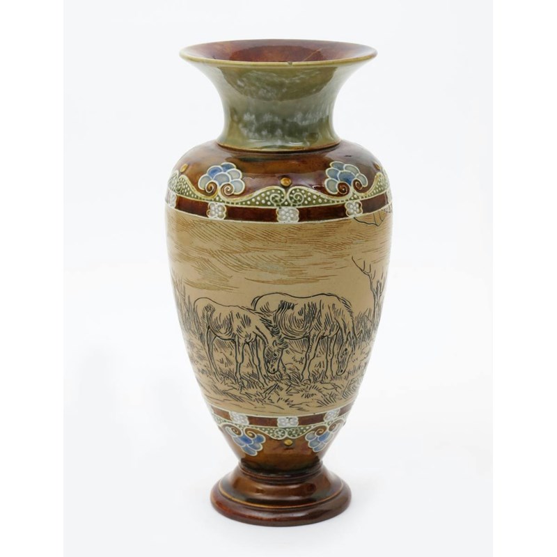 A Doulton Lambeth stoneware vase by Hannah Barlow, incised with a frieze of horses, between bands of slip decorated flowers and foliage, in shades of green, brown, blue and white, on a buff ground, impressed mark, incised monogram, professionally restored neck 27.5cm. high