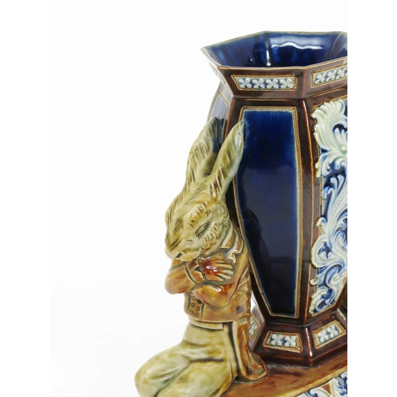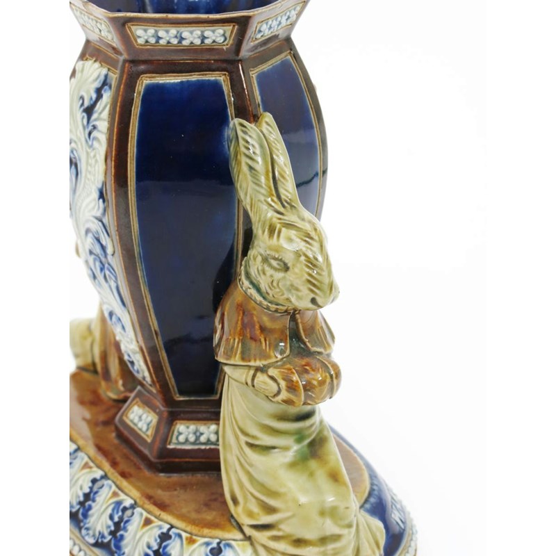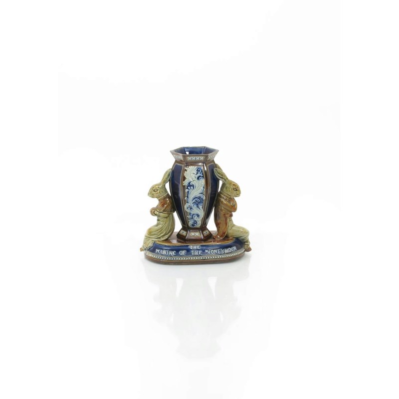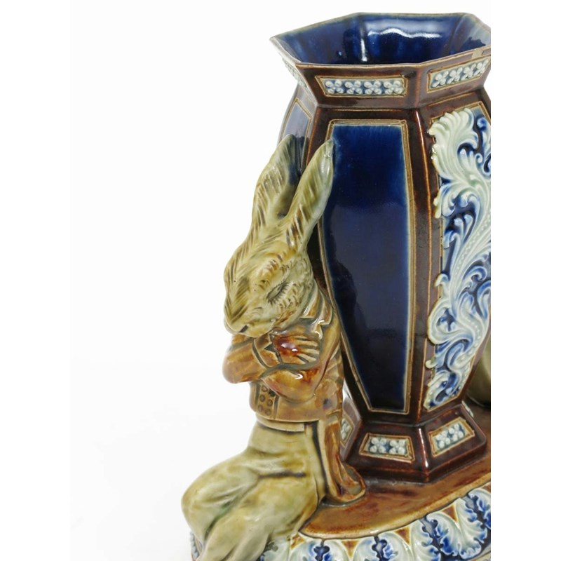 'The Waning of the Honeymoon' a rare Doulton Lambeth vase designed by George Tinworth, modelled as a hare bride and groom seated, their backs to each other, either side of a large Doulton vase, glazed in shades of green, blue and brown impressed mark, incised ES monogram, two small glaze chips to the top rim, 17cm. high