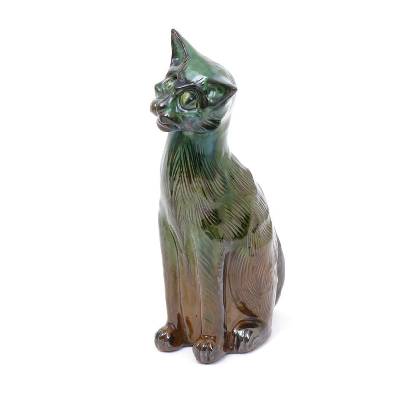 A C H Brannam pottery model of a cat, modelled seated with head slightly tilted, glazed green, yellow and brown, incised C H Brannam Barum, professional restoration to one ear 28cm. high