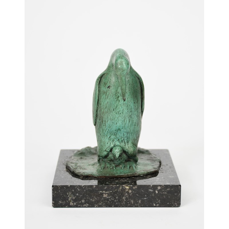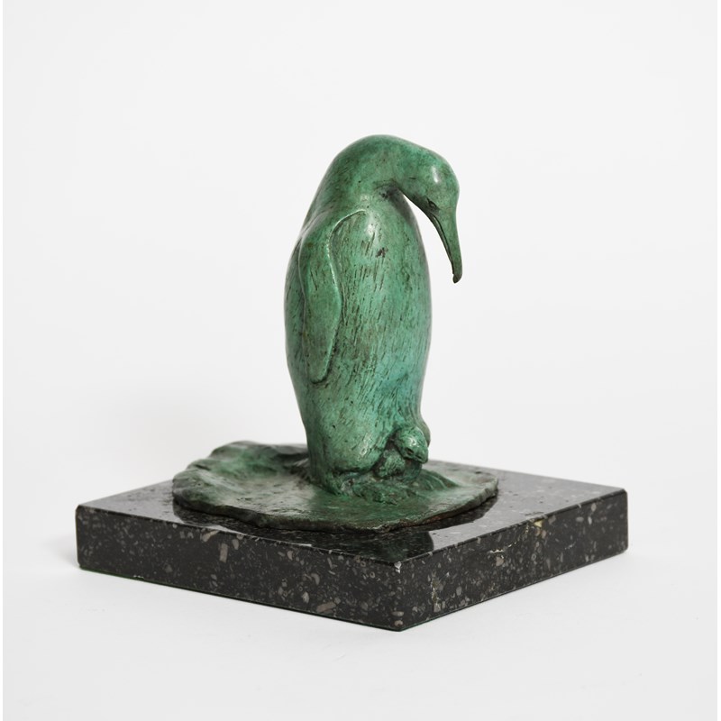 ‡ David Cornell (born 1935) Penguin with young verdi gris bronze on polished marble base signed...