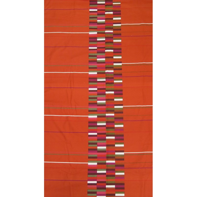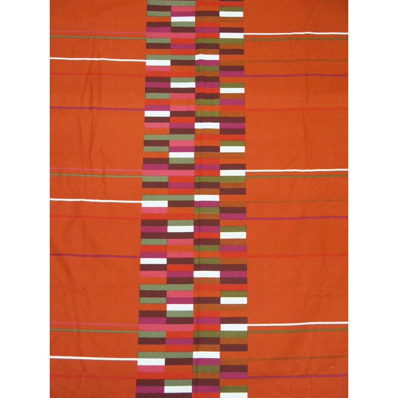 Causeway a screen printed cotton textile designed by Lucienne Day for Heal's, designed in 1967, printed with abstract column in purple, green and white flanked by blocks of coral red signed to selvedge, 420 x 126cm.