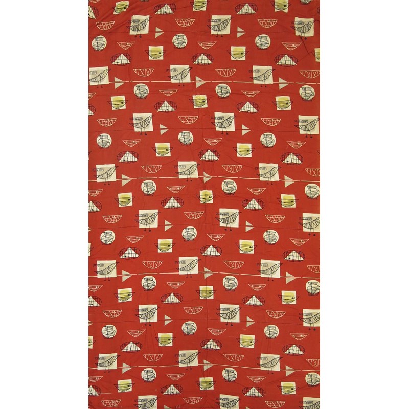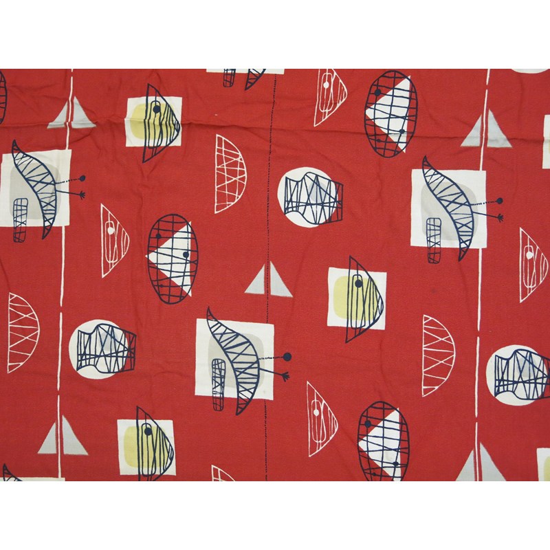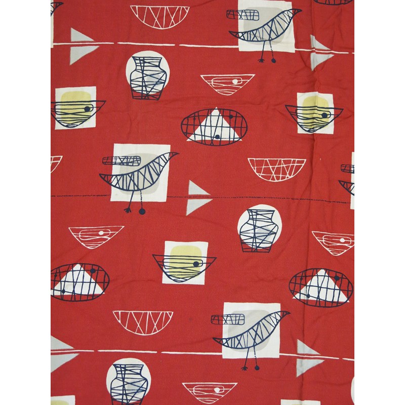 Bird and Chair a pair of printed cotton textiles designed by Marian Mahler manufactured by David Whitehead Ltd, designed in 1952, printed with vases, bowls and birds in black, mushroom and yellow on a red ground unsigned, fraying to edges and wear, 205 x 112cm (2)
