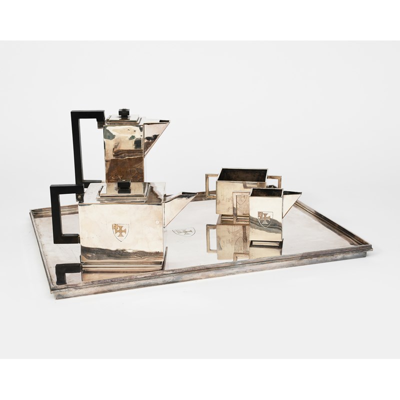 A Charles Boyton Modernist electroplated four piece tea service on tray, square section on stepped foot with stepped shoulder, comprising teapot and hinged cover, hot-water pot and hinged cover, milk-jug and sugar basin, on a rectangular tray, teapot and hot-water pot with ebonised wood handles, each with engraved cross in shield for Bede College Durham University, unsigned, 21cm high (hot-water pot), 50 x 38cm (tray) (5)