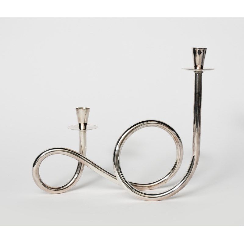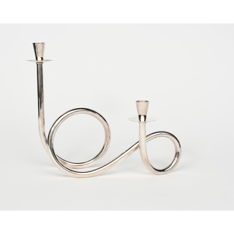 A De Vecchi T8 silver candlestick designed by Piero De Vecchi, originally designed and made for the Eighth Milan Triennale, 1947, scrolling tube body with two flaring conical sconces, stamped marks below sconce, 29cm. wide, 25cm. high