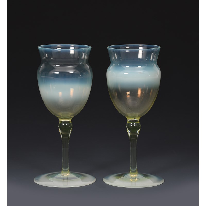 A pair of James Powell & Sons Whitefriars straw opal wine glasses designed by T G Jackson