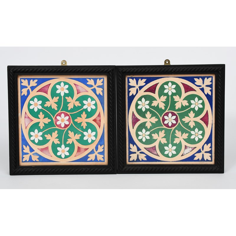 A pair of Minton's tiles designed by Augustus Welby Northmore Pugin, each decorated with a radiating floral roundel in shades of blue, green, claret and salmon pink, in modern ebonised wood frames, impressed grid mark to back, hairline to one, 20cm. square (tiles), (2)