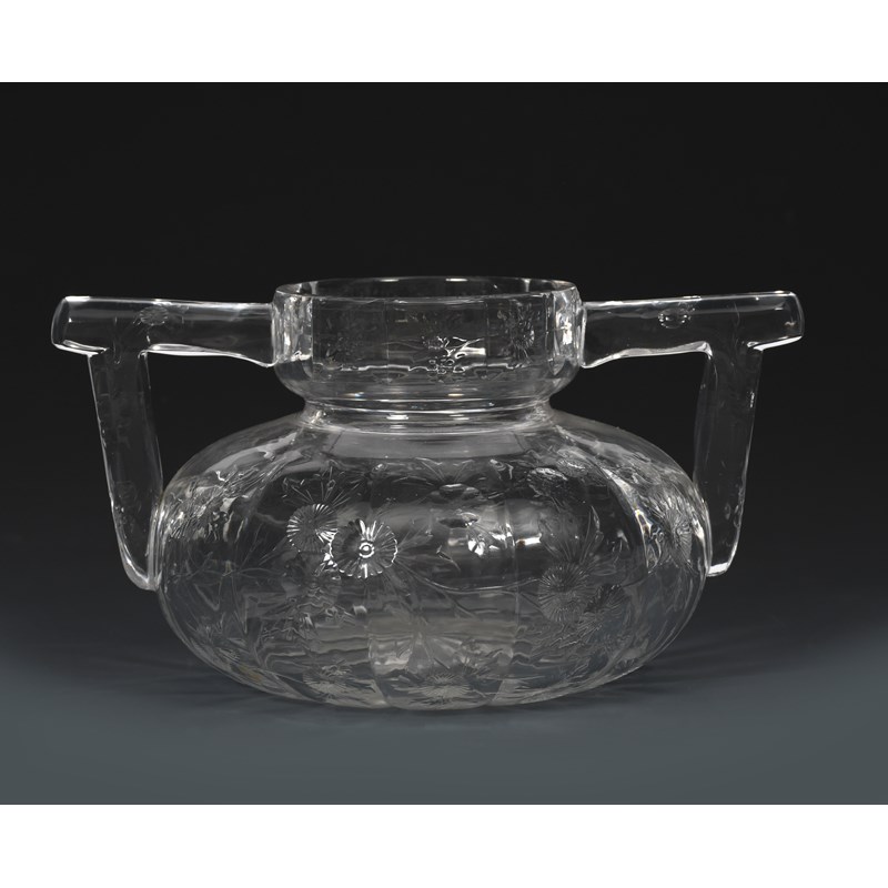 An Aesthetic Movement Stevens and Williams rock crystal glass flower vase probably cut by John Orchard, ovoid with collar rim and applied angled handles, the faceted body engraved with Japoniste prunus sprays unsigned, 10.5cm. high, 18.5cm. wide